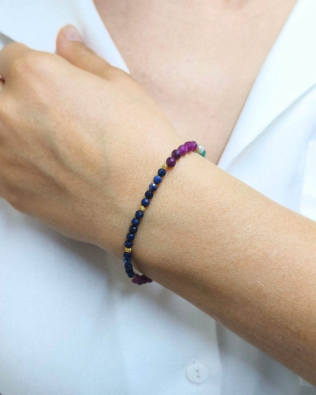 Safir taşı ile huzuru, yakut taşı ile tutkuyu, zümrüt taşı ile dengeyi bir araya getiren bu özel doğal taş bileklik; şıklık, enerji ve zarafeti aynı anda sunar. El yapımı tasarımıyla hem günlük kullanımda hem de özel günlerde stilinizi tamamlayacak güçlü bir enerjidir.